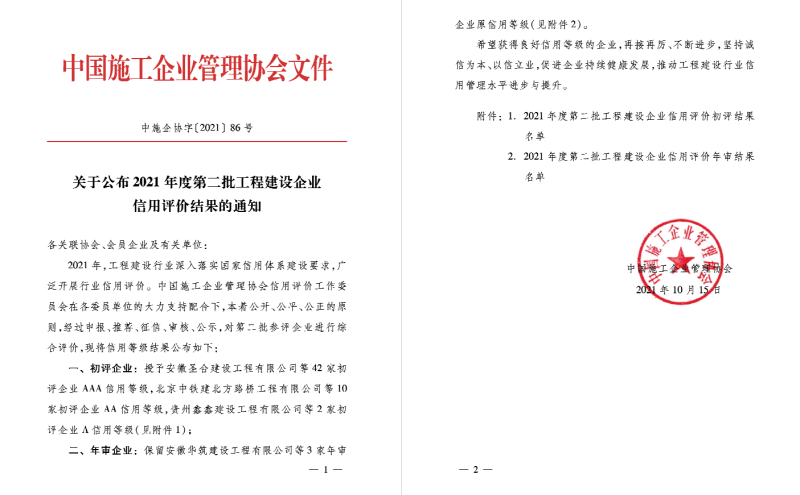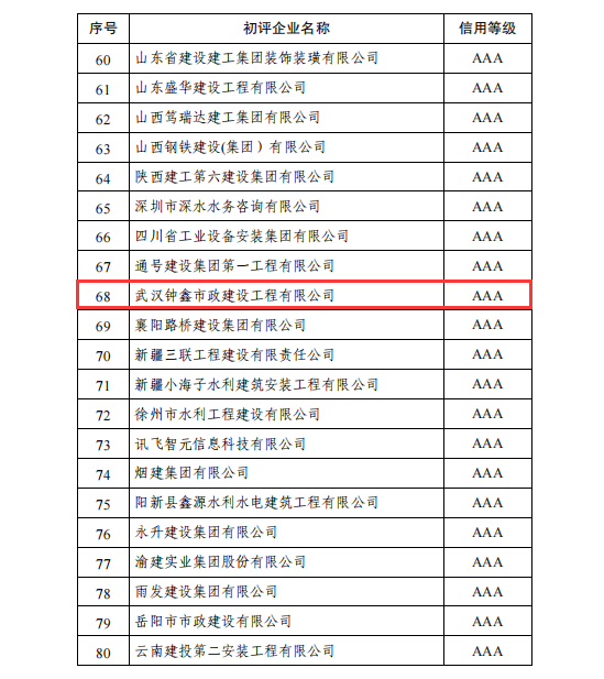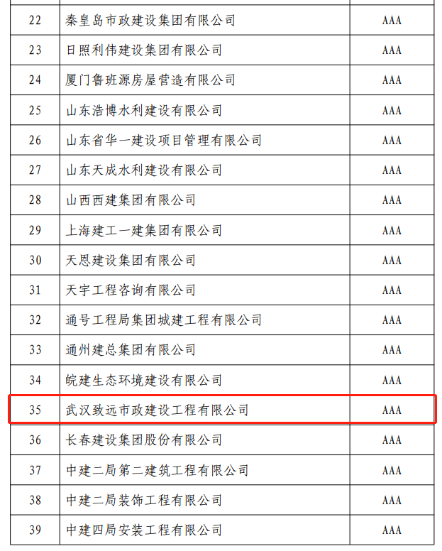 近日,中國施工企業管理協會發布,2021年度第一批、第二批工程建設企業信用評價結果名單漢陽市政鐘鑫公司、致遠公司榮獲信用等級AAA級。截止目前,漢陽市政及旗下共有5家企業獲此榮譽。