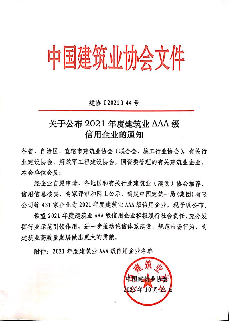全國建筑業AAA級信用企業是以企業基本素質、經營能力、財務指標、管理指標、競爭力指標、市場行為指標等多項指標進行綜合評估,評估總分90分(含)以上的企業入選AAA信用等級企業。并分為AAA、AA、A、B、C三等五級。AAA企業為信用企業的最高級,表示受信單位誠信度很高,各項指標優秀,企業素質很高,誠信意識強、經營狀況好、履約能力強、社會信譽好。