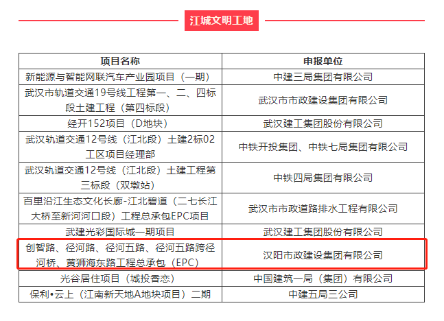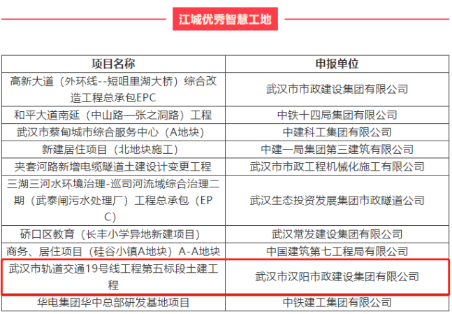 近日,由楚天都市報(bào)、武漢建筑業(yè)協(xié)會、武漢市建筑行業(yè)工會聯(lián)合會聯(lián)合主辦的2021年“創(chuàng)領(lǐng)智控杯”江城“雙十大”選樹結(jié)果揭曉,漢陽市政高新三路(三環(huán)線-外環(huán)線)改造提升工程總承包(EPC)獲評“江城十大智慧工地”,創(chuàng)智路、徑河路、徑河五路、徑河五路跨徑河橋、黃獅海東路工程總承包(EPC)獲評“江城文明工地”,武漢市軌道交通19號線工程第五標(biāo)段土建工程獲評“江城優(yōu)秀智慧工地”。