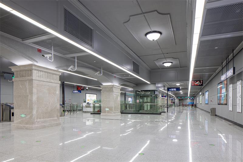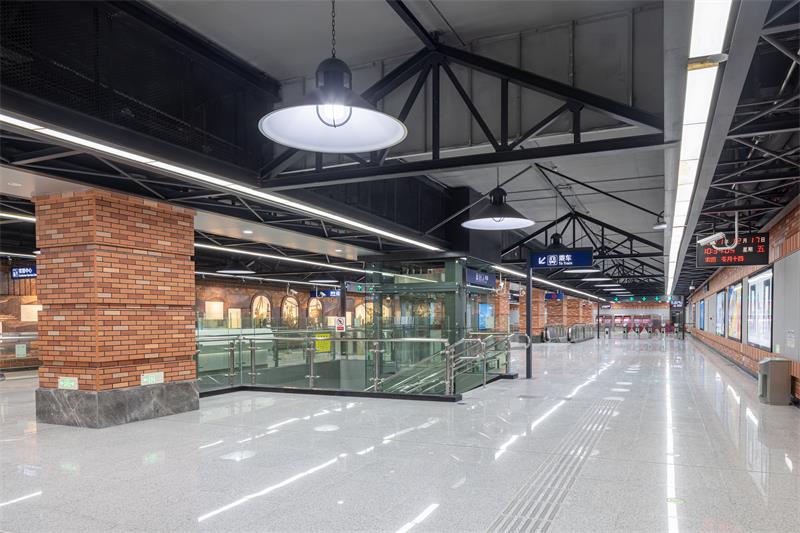 紅鋼城站以“紅城歲月”為主題,從紅鋼城的原始風(fēng)貌入手,車站立柱提取“紅房子”紅磚元素,采用仿紅磚質(zhì)感的高強(qiáng)纖維板進(jìn)行仿制,墻面還原老建筑形態(tài),上下采用紅色仿制磚,中間區(qū)域采用灰色的高強(qiáng)纖維水泥板,以打造懷舊的老武漢歲月感。車站照明燈具設(shè)計(jì)結(jié)合了極富工業(yè)元素的工礦燈,旨在將地鐵空間融入周邊環(huán)境,凸顯老武漢的街景特色。