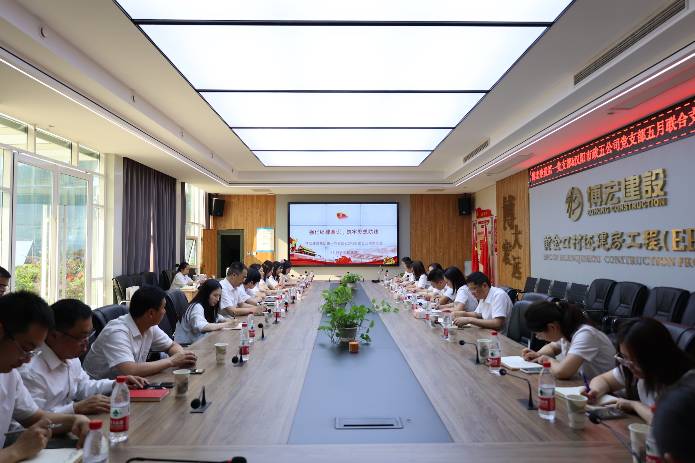 ? ? 5月24日,漢陽市政博宏建設(shè)第一黨支部與漢陽市政五公司黨支部共同開展“強(qiáng)化規(guī)矩意識,筑牢思想防線”五月聯(lián)合支部主題黨日,共計32名黨員代表參加活動。活動在黃金口村還建房項目會議室舉行。
